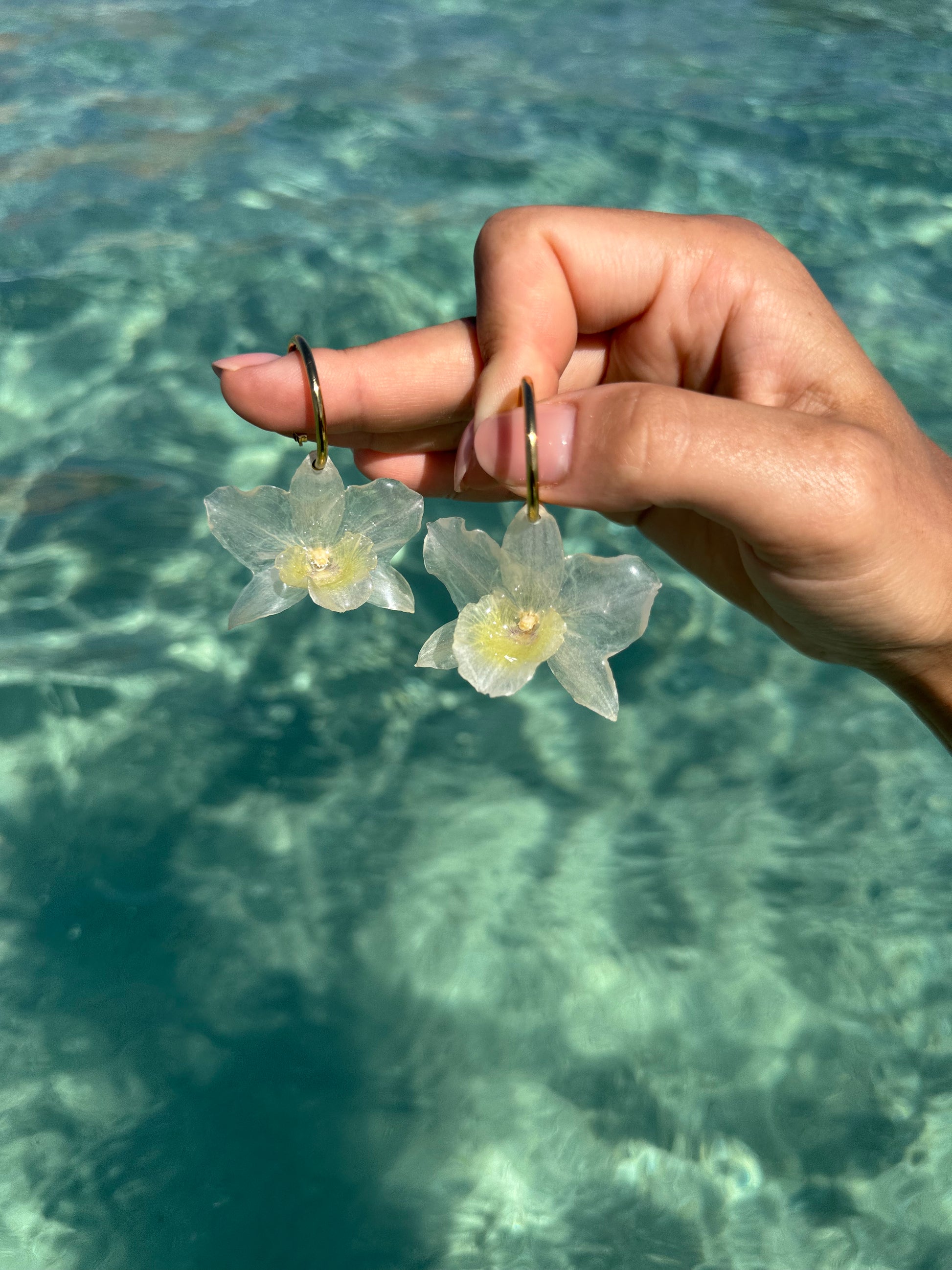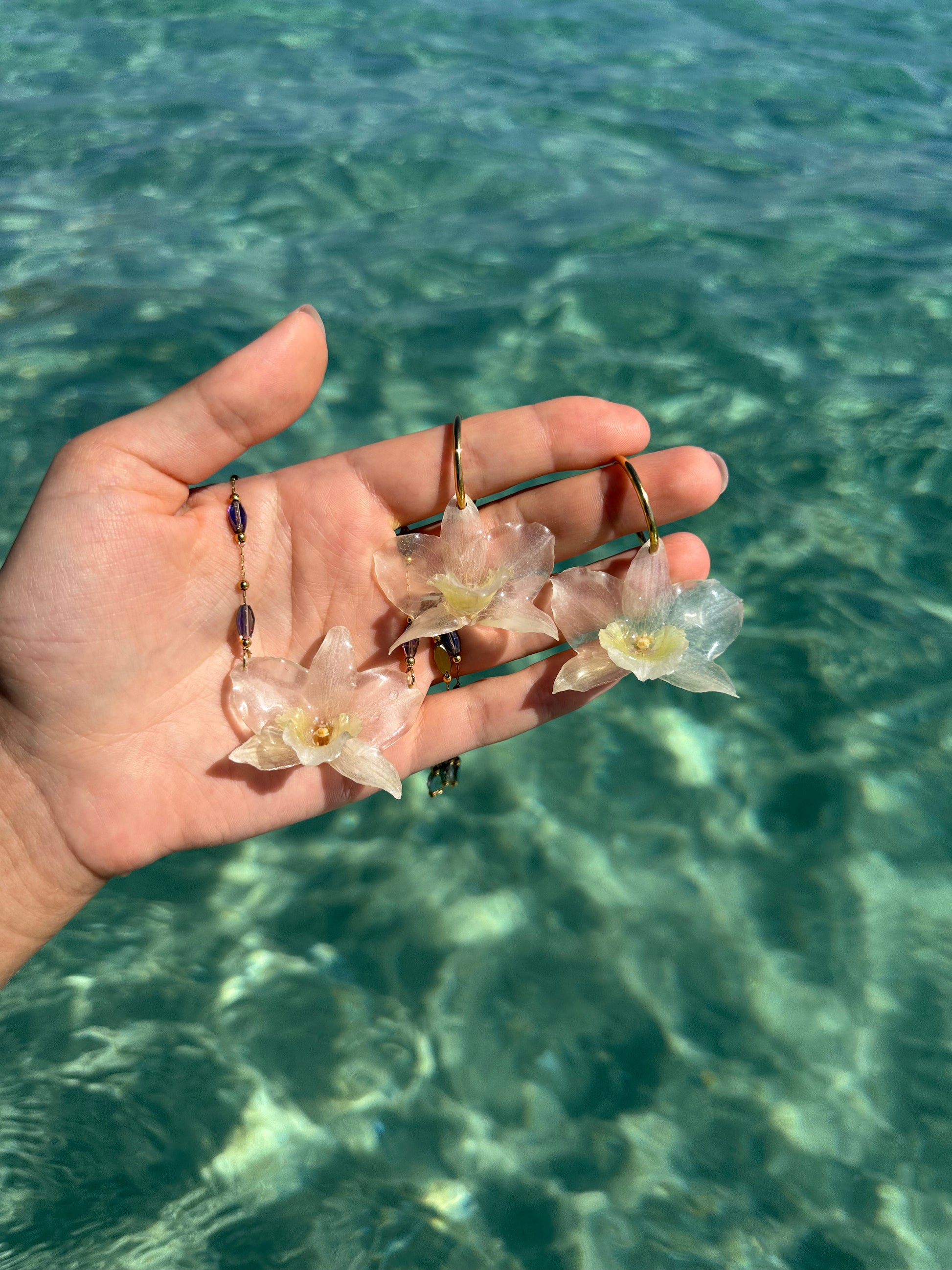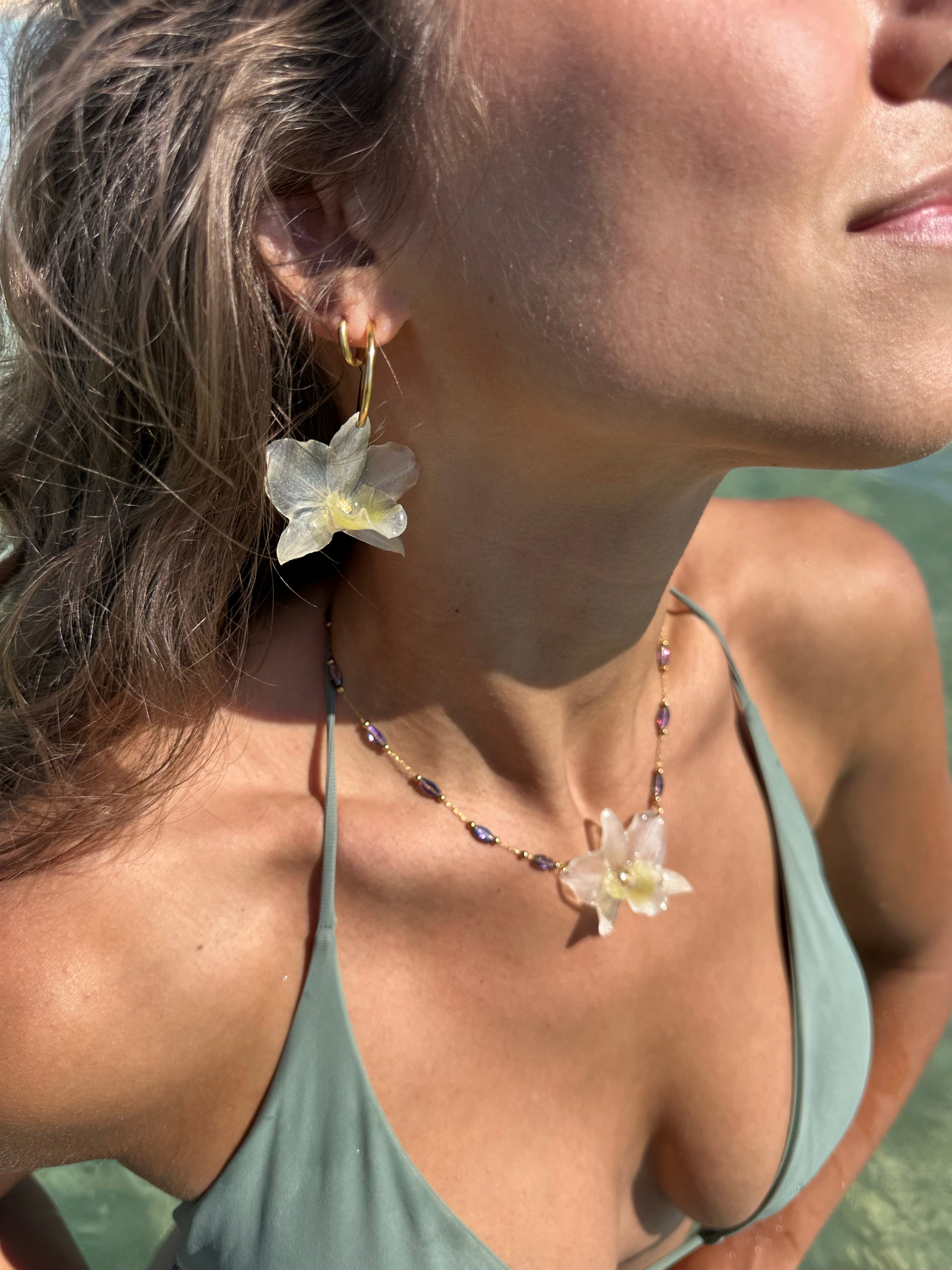 Flowers hang on 18K gold plated stainless steel jewelry. All metals used are tested and certified to be hypoallergenic.